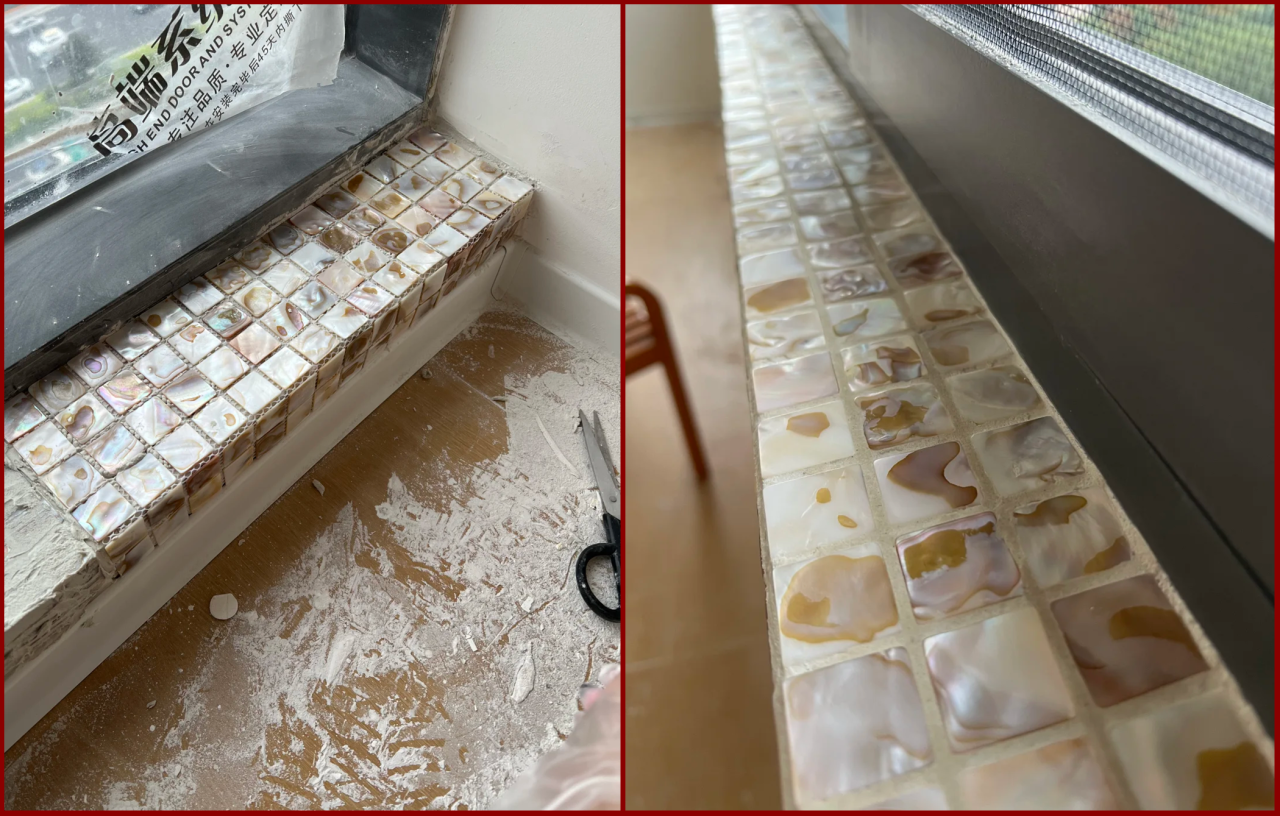最近网上比较火的,业主自装式马赛克窗台铺贴法,效果很不错,可以根据自己的喜好选择马赛克样式,也是一个比较不错的选择。