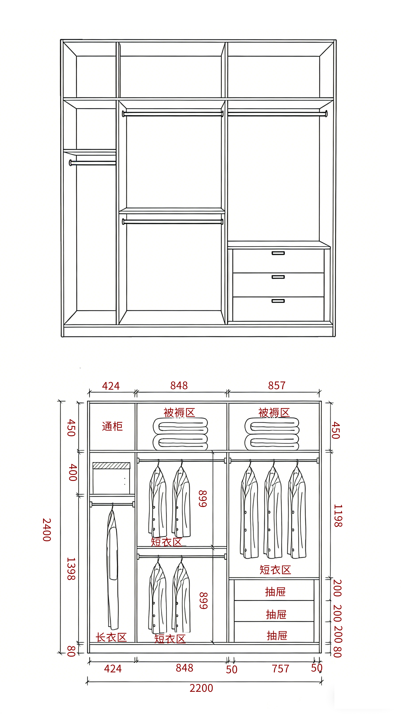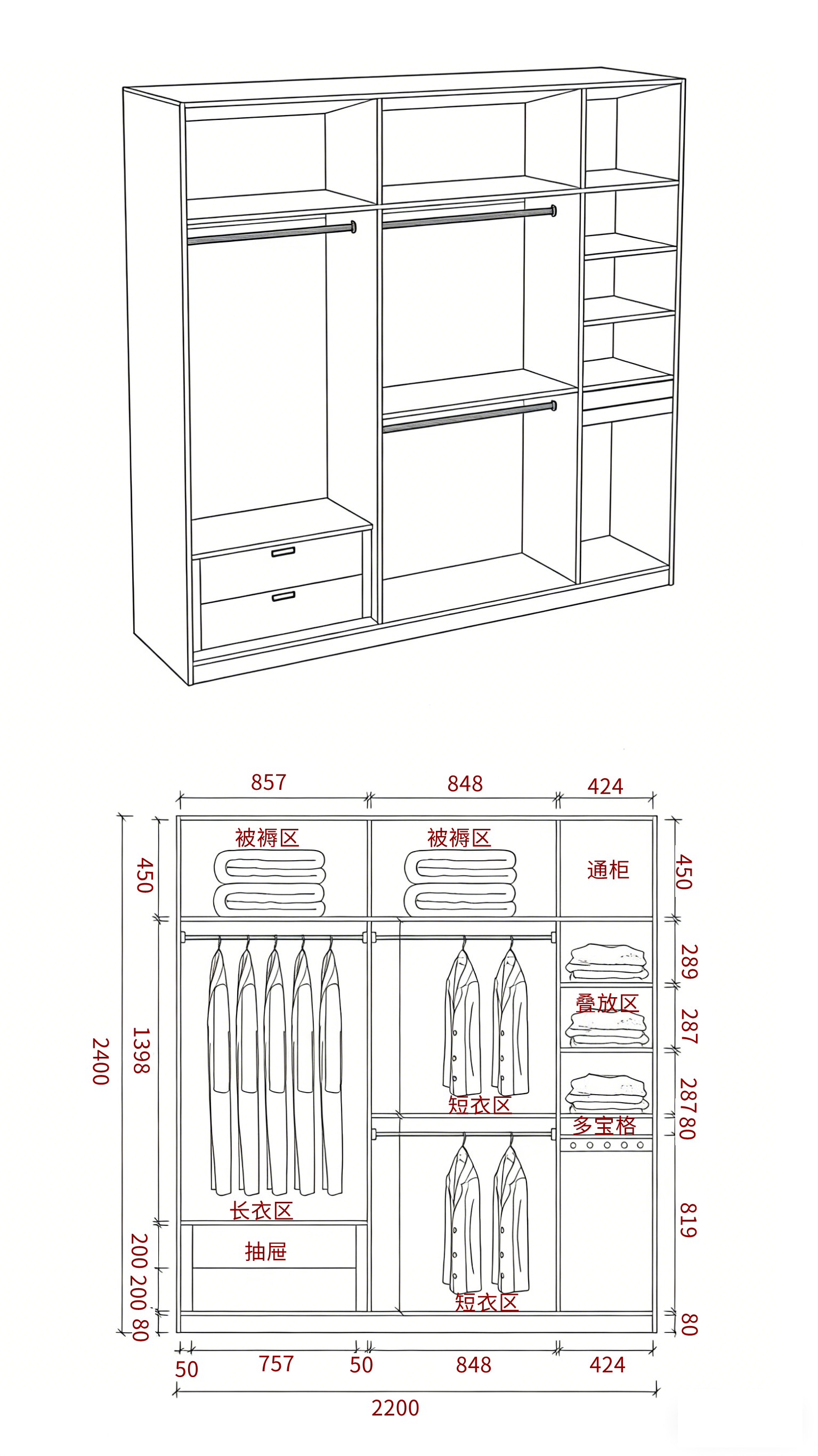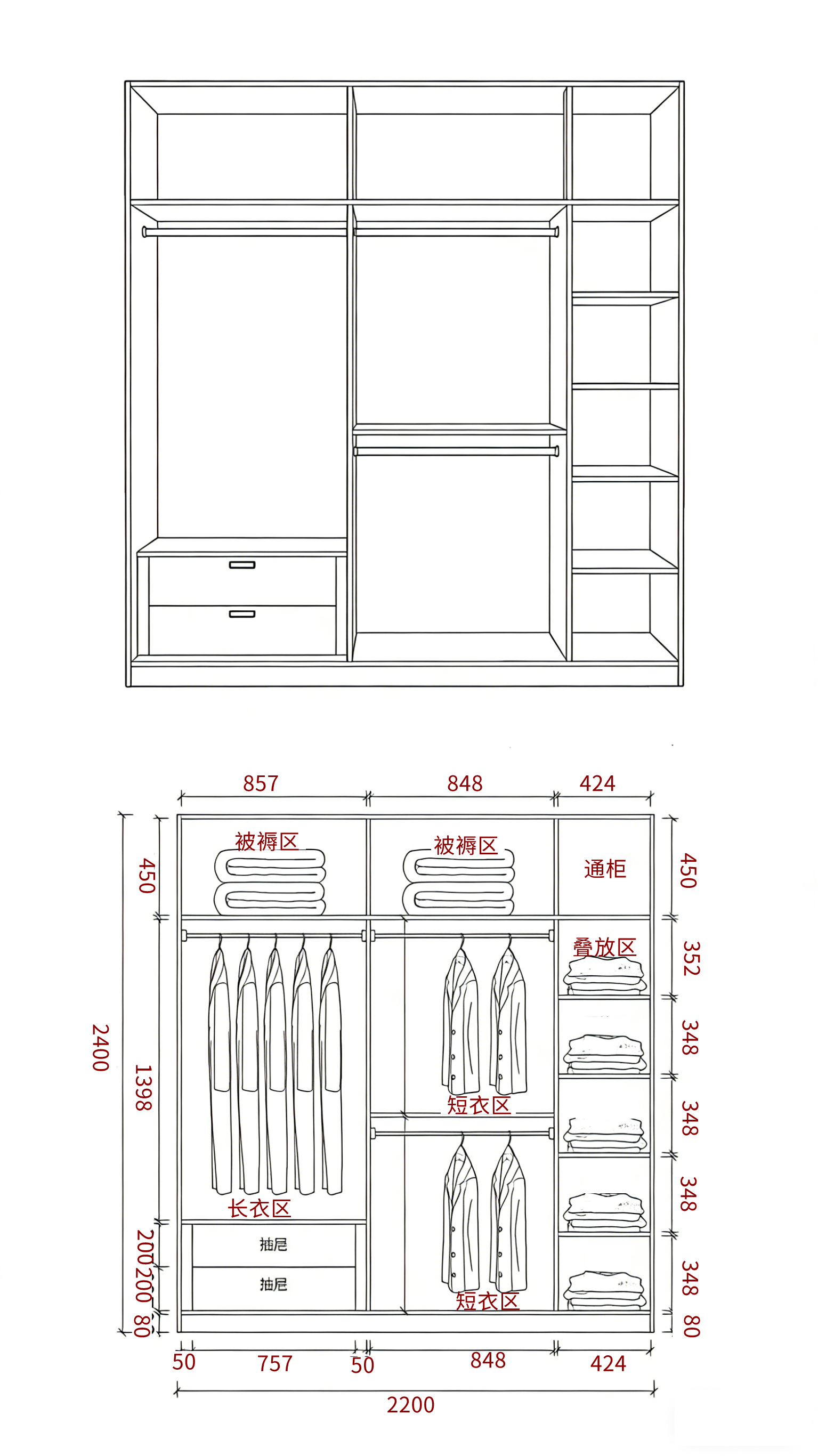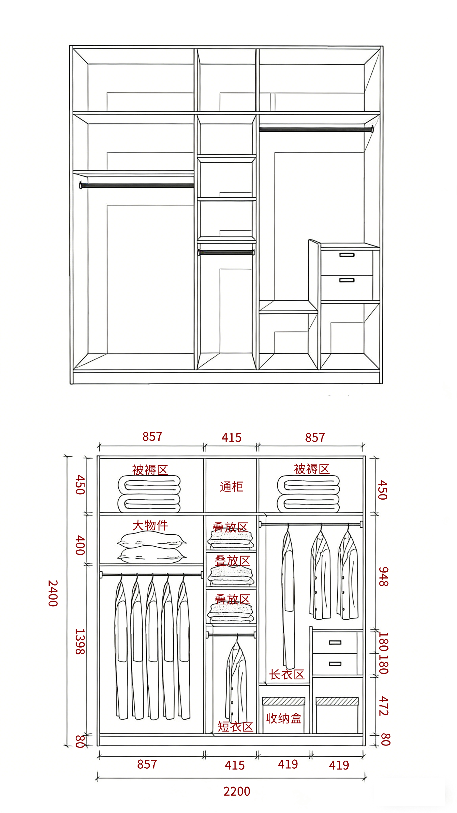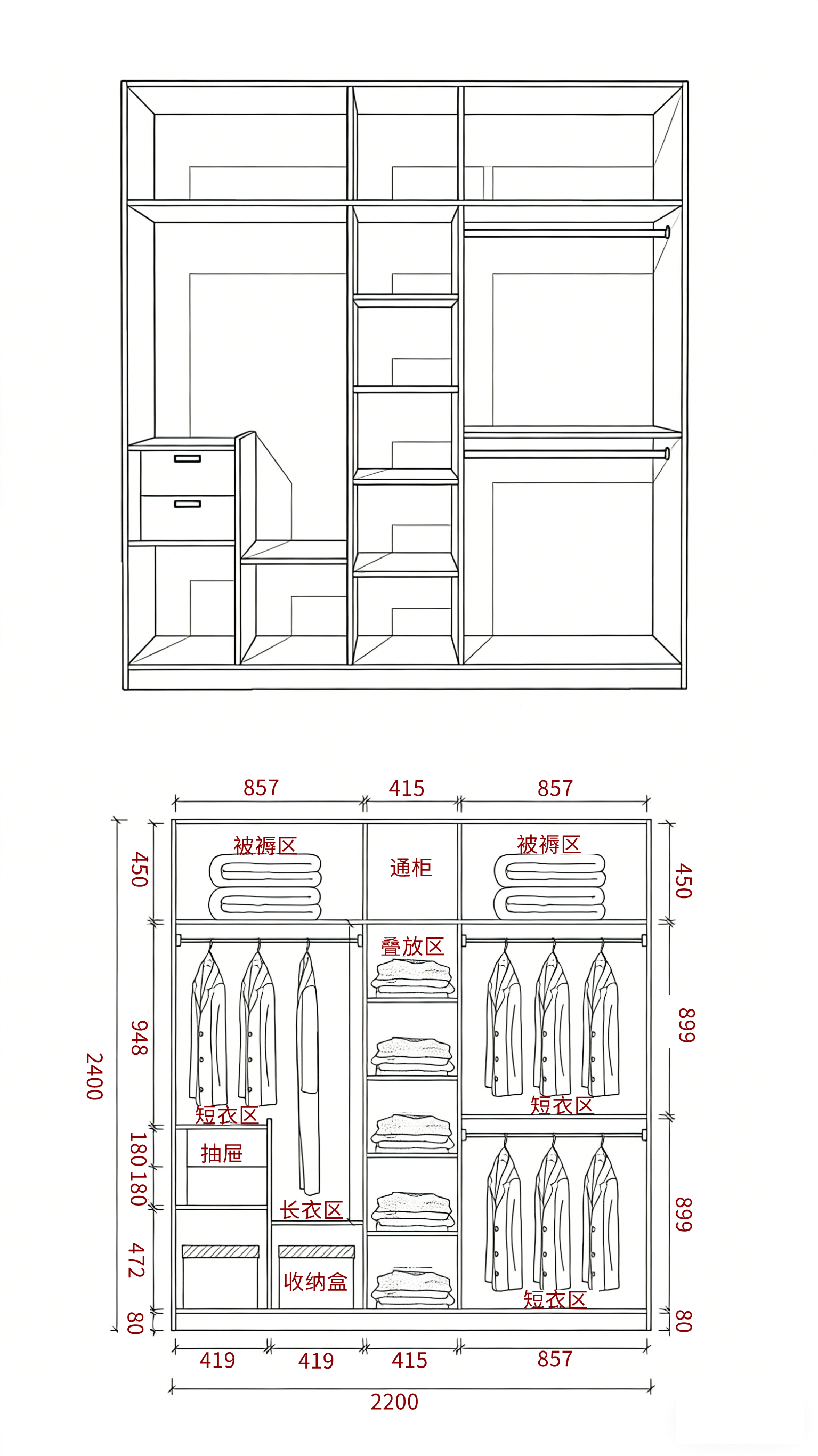 总高控制在 2400-2550mm,底部留 80mm 踢脚线,顶部 450-550mm 做被褥区,适配季末收纳;中部挂衣区