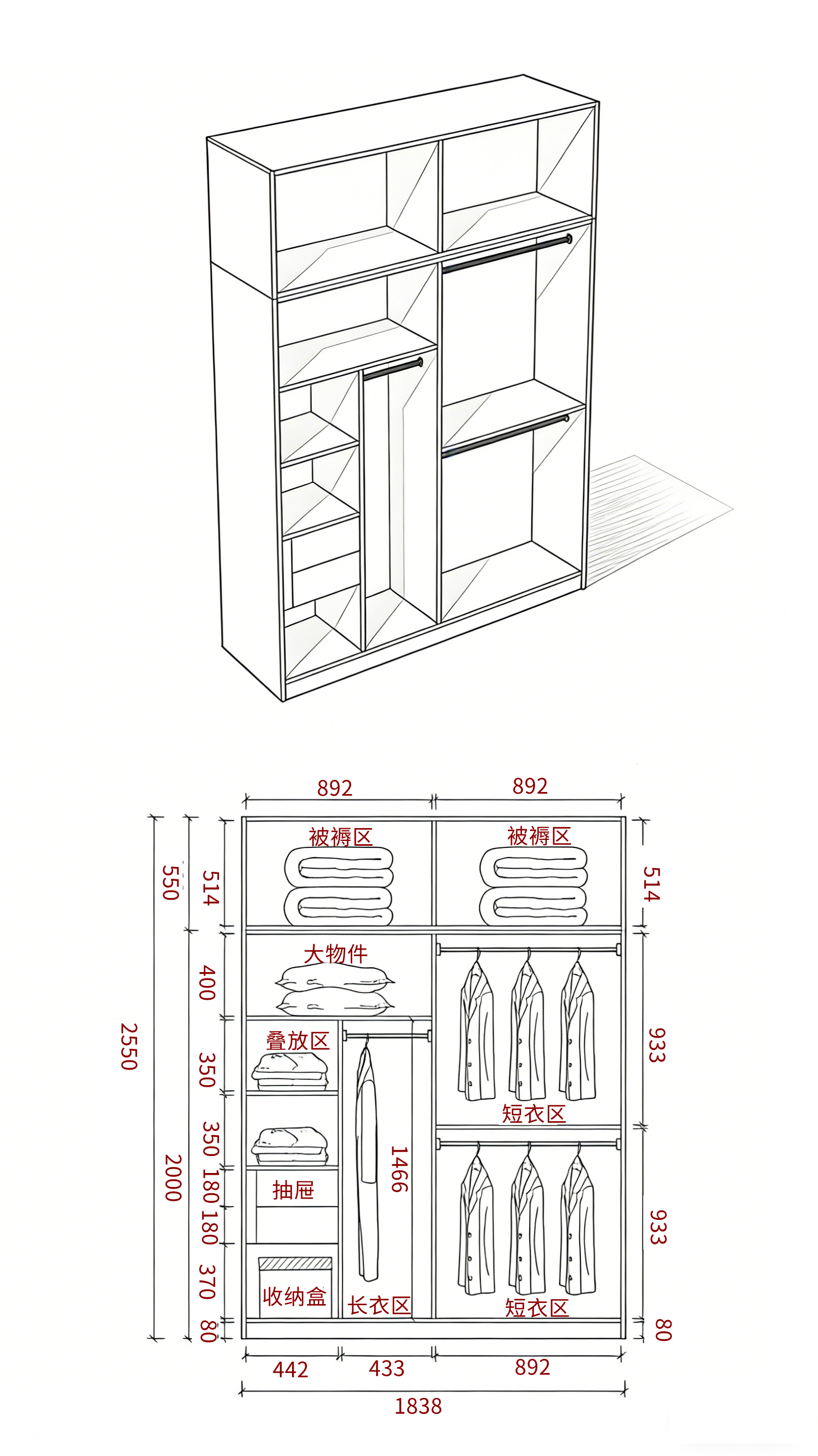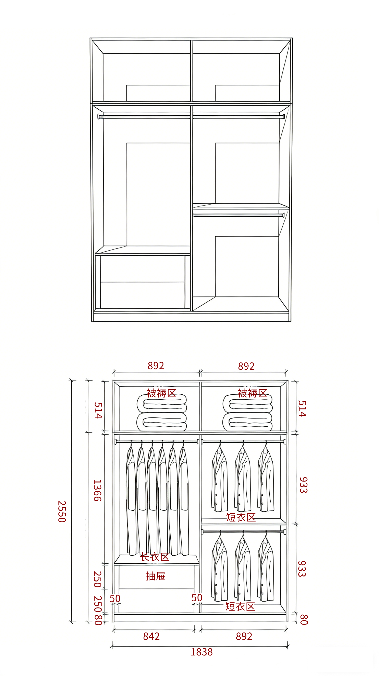 长衣区 1366-1466mm(适配大衣、长裙),短衣区 899-948mm(适配衬衫、外套),避免衣物堆积褶皱。