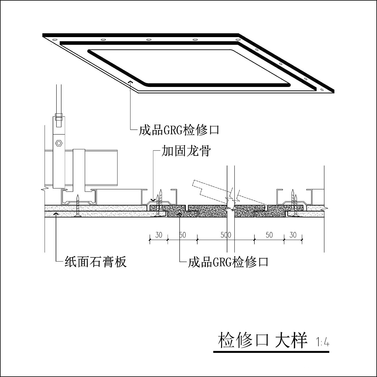对于检修口、轻型嵌入灯具预留口部位,四周要增加轻钢副龙骨,检修口建议采用成品GRG材料或石膏制品。