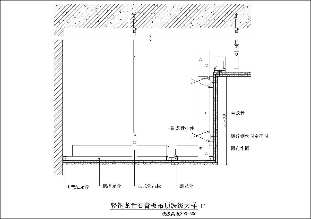b、跌级高度<300mm,可采用细木工板作为跌级龙骨,>300mm,建议采用副龙骨,减少变形。