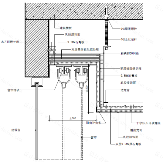 在dop设计之前的文章《这才是窗帘盒的正确设计方式》(点击查看详情)中,有专门讲解窗帘盒的做法,而施工时主要控制固定窗帘轨道的承载力,轨道上方一定要增加细木工板,固定轨道。