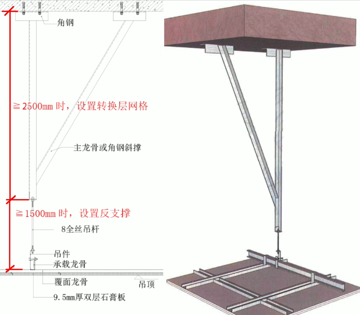 当吊顶内部空间 ≥3000mm 或反支撑垂直长度 ≥1500mm 时,应设置转换层。
