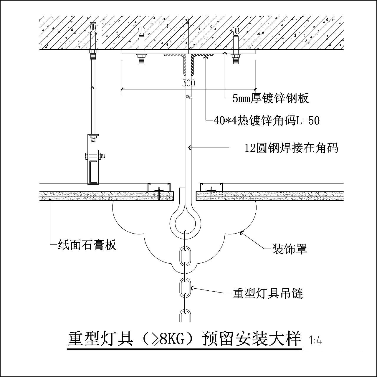 轻型吸顶灯具安装部位可在顶部预留细木工板,重型灯具(>8KG)严禁直接安装在天花龙骨上,必须预留在结构楼板上。
