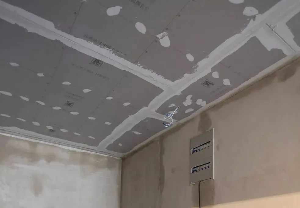 石膏板缝隙用石膏粉拌白乳胶或聚乙烯胶水制成嵌缝石膏膏体,密实地填充缝隙,注意抹刀要收平,整体干透后粘贴嵌缝带。