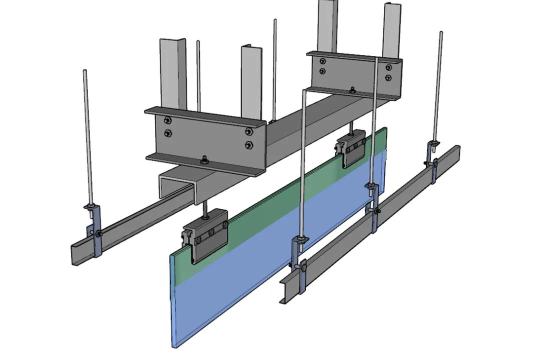 将槽钢与玻璃基层钢架连接处满焊并做好防火防锈处理,并安装好玻璃吊挂件。