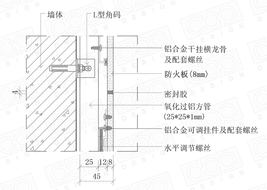 干挂结构主要是针对9mm的成品双面复合防火板和8mm抗倍特所采用的,承载龙骨为钢材或铝合金型材,用专用的标准扣片和可调节扣片将其固定到板材上进行安装的一种方式。