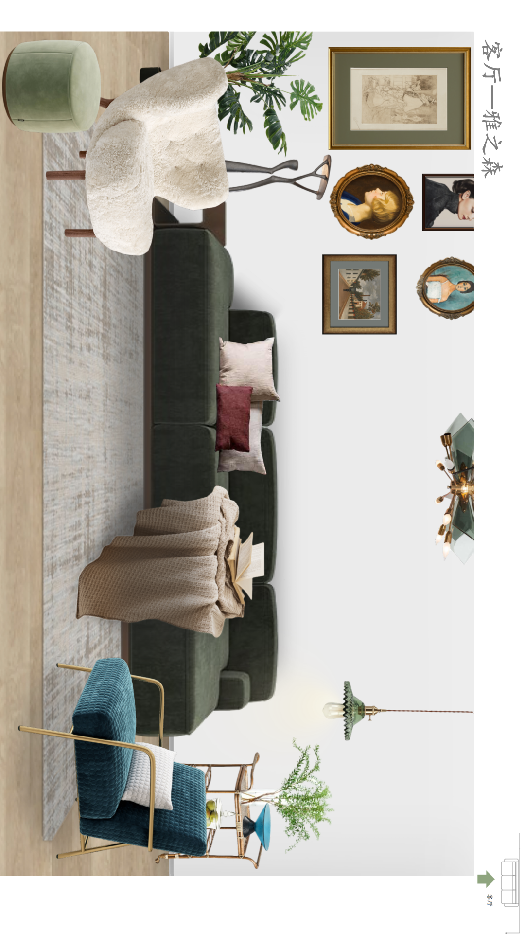 作品简介:雅·夏之森 是一个大平层项目。室内采用复古的绿色调、优雅稳重的蓝色调、温柔安静的莫兰迪色调和温暖的木色,搭建了安静又复古的空间。家具多采用较深的木色并搭配绿色植物营造自然的氛围,并多以金属色进行点缀空间。本案注重自然与优雅灵魂的融合,营造清新诗意、闲适慵懒的氛围。用生命与艺术和谐共生的设计思路,通过物件形色质的有机融合,呈现高品质的室内空间。