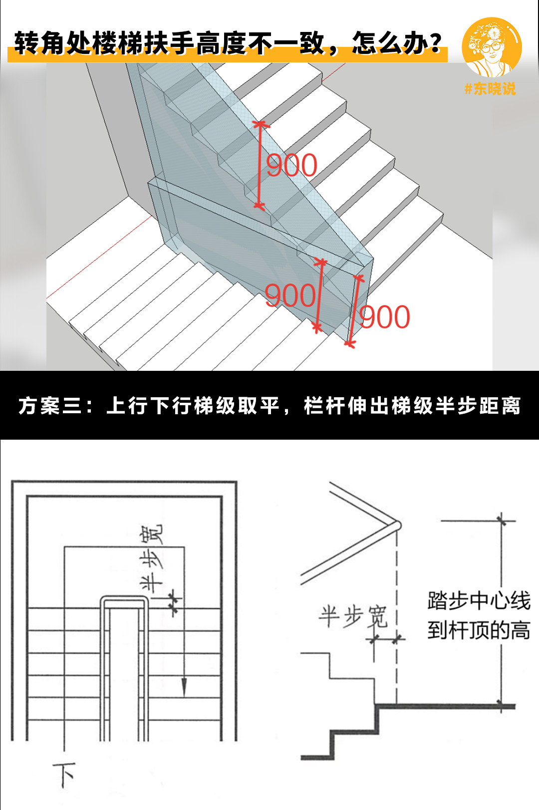 方案三是解决:当上下级踏步已经做成平行了,现场已经施工完成了,那么我们做栏杆时则可以考虑把栏杆往前推半个踏步位,然后验收时计算踏步中间到栏杆的高度。