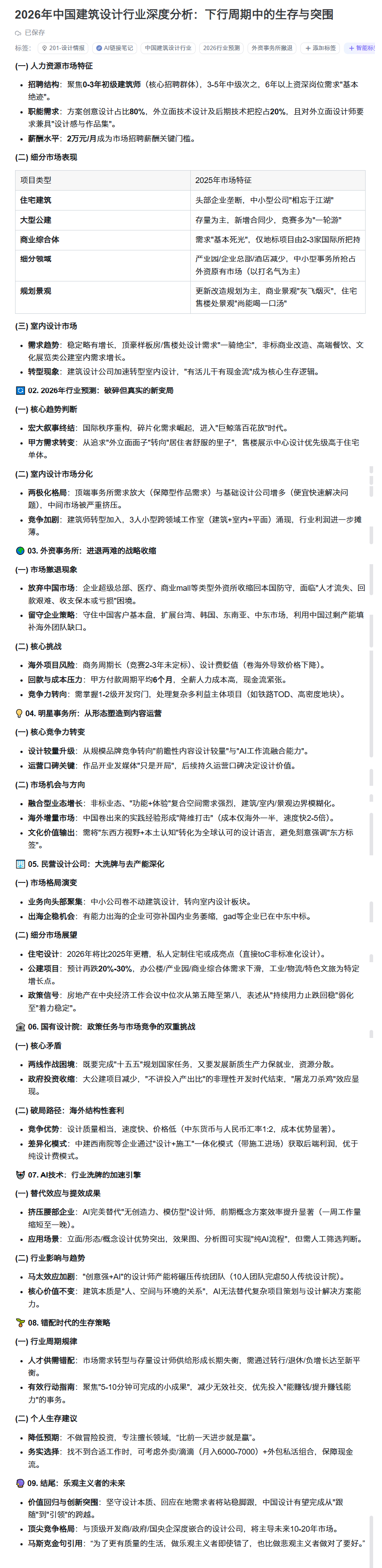 结合2025年的数据、从明星事务所、民营设计公司、外资设计院、国有设计院,的竞争格局,市场展望,都做了比较深度的分析。