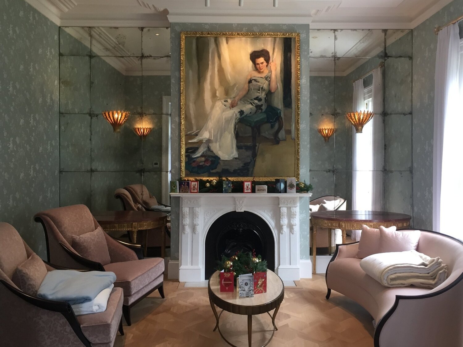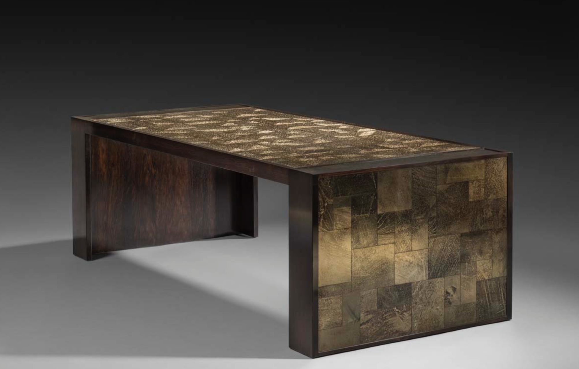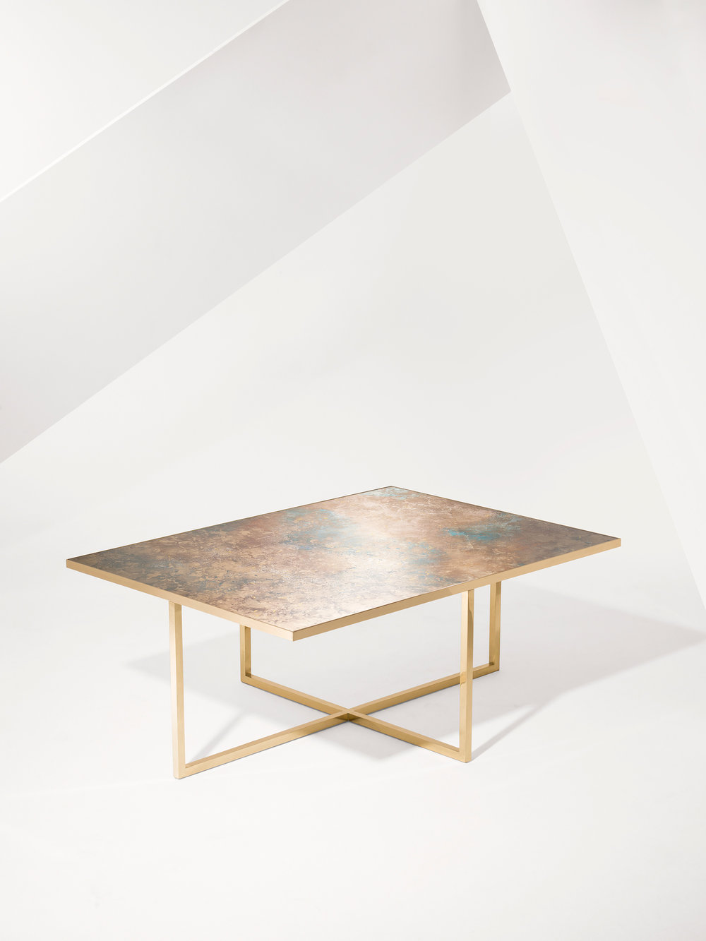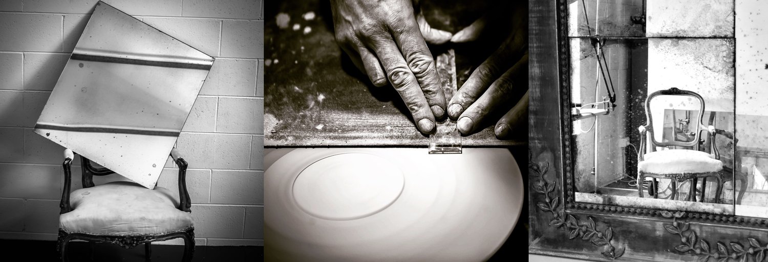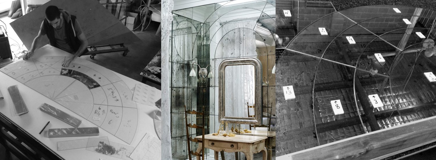 这种工艺称做 verre églomisé,最早源自法国,即在玻璃的背面镀上金、银和铂等金属箔,制作出柔软的半反射表面,但是该表面可能会老化或受压。