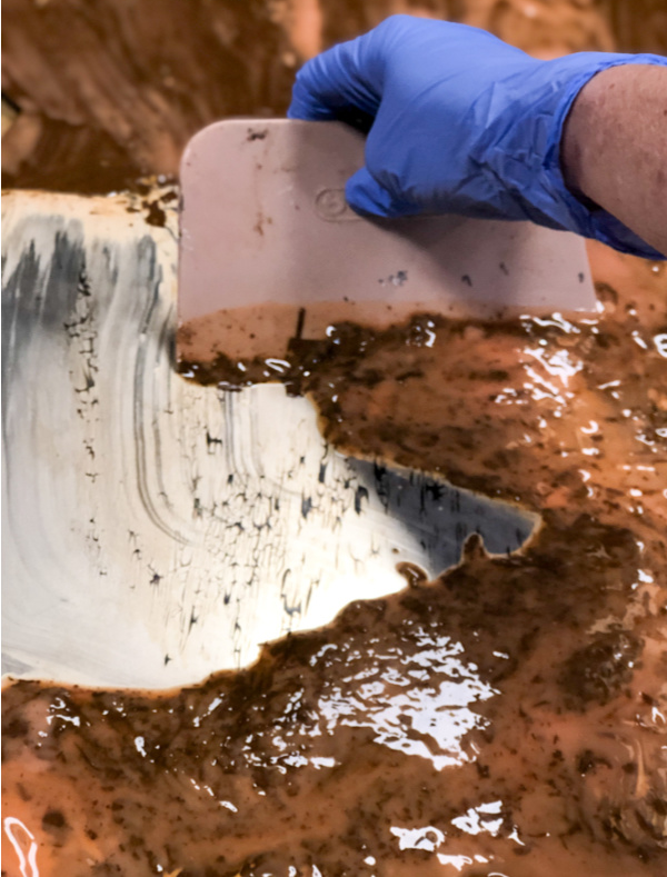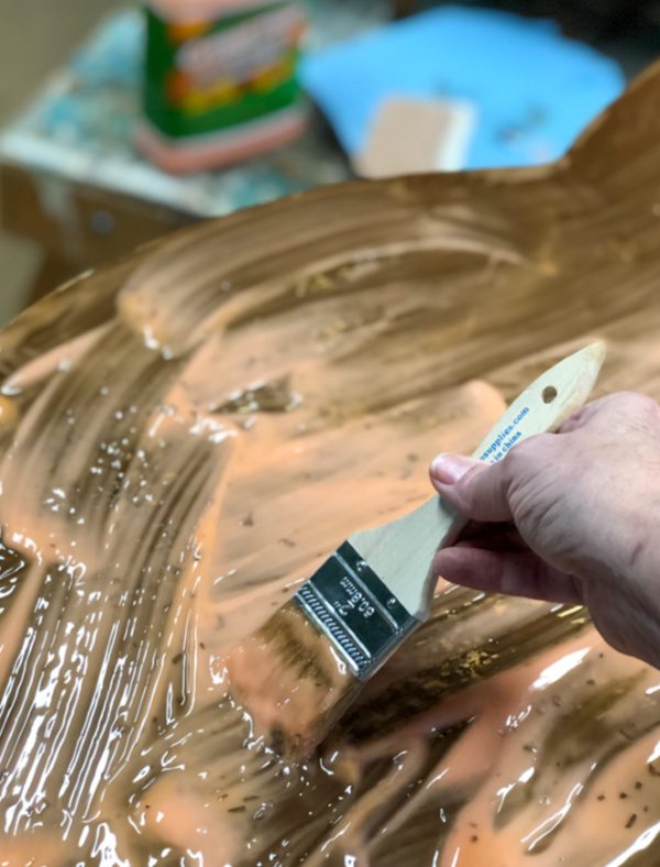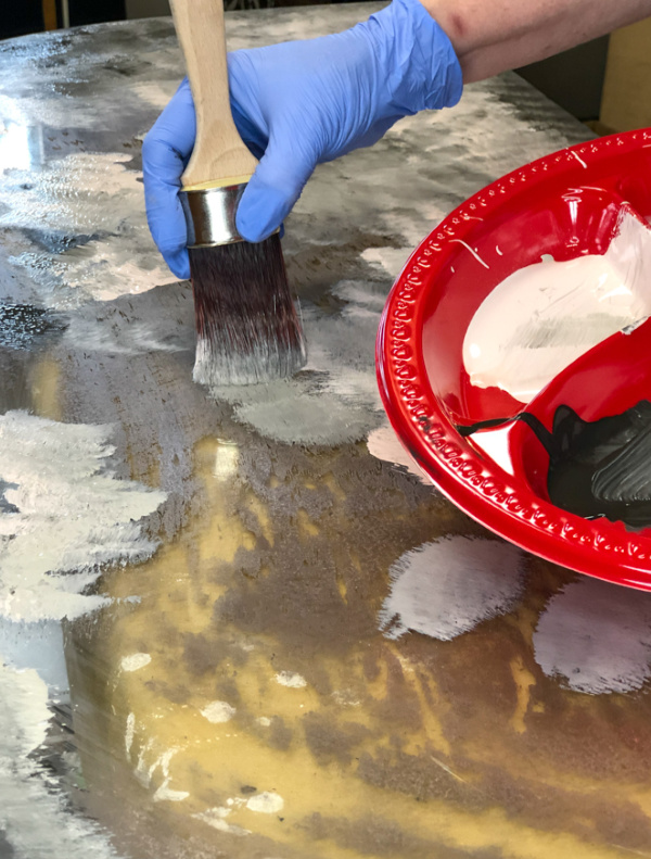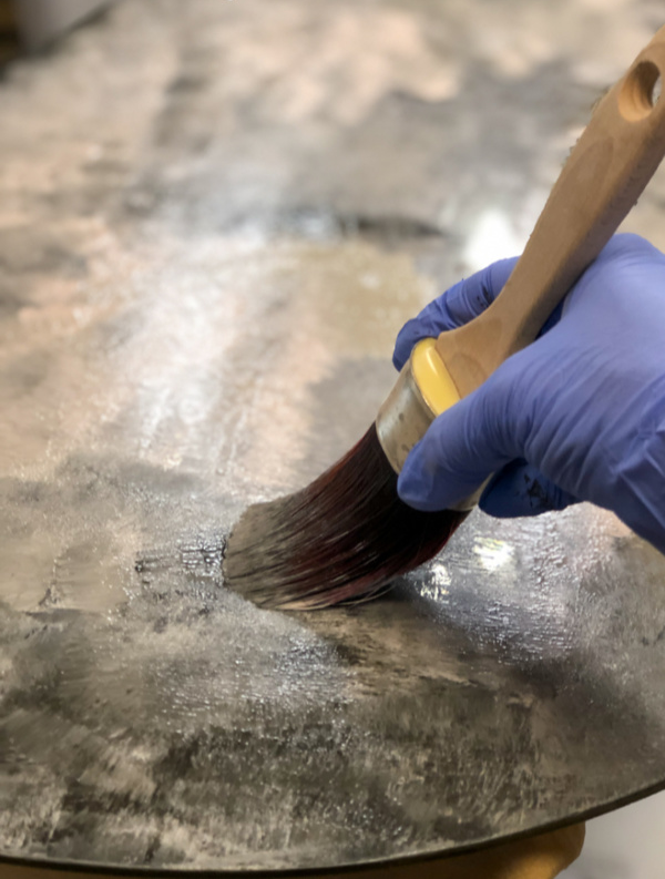 在镜子的背面用平底刷将油漆刷了上去粉质矿物漆。