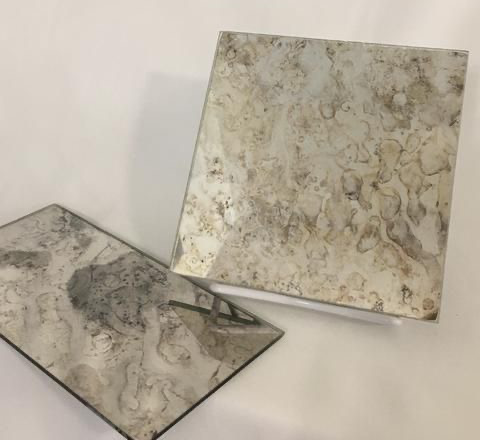 上述步骤中,第二步破坏银镜过程,我们也称做旧,使用不同的方法可以创造更多图案的仿古镜。