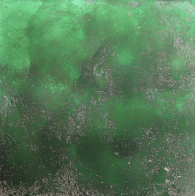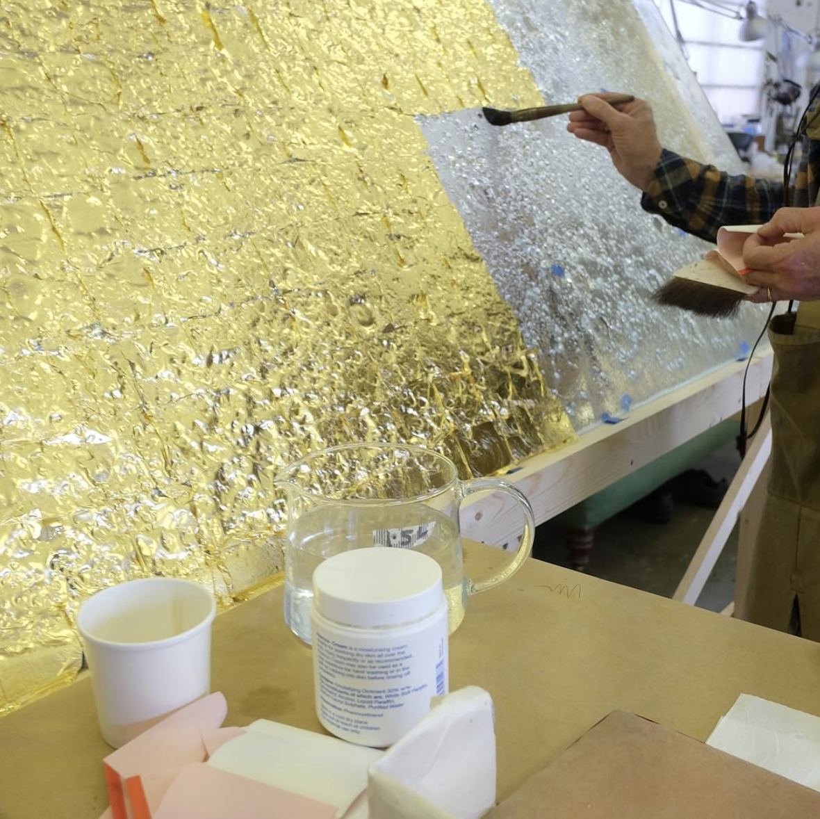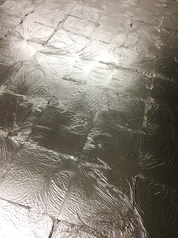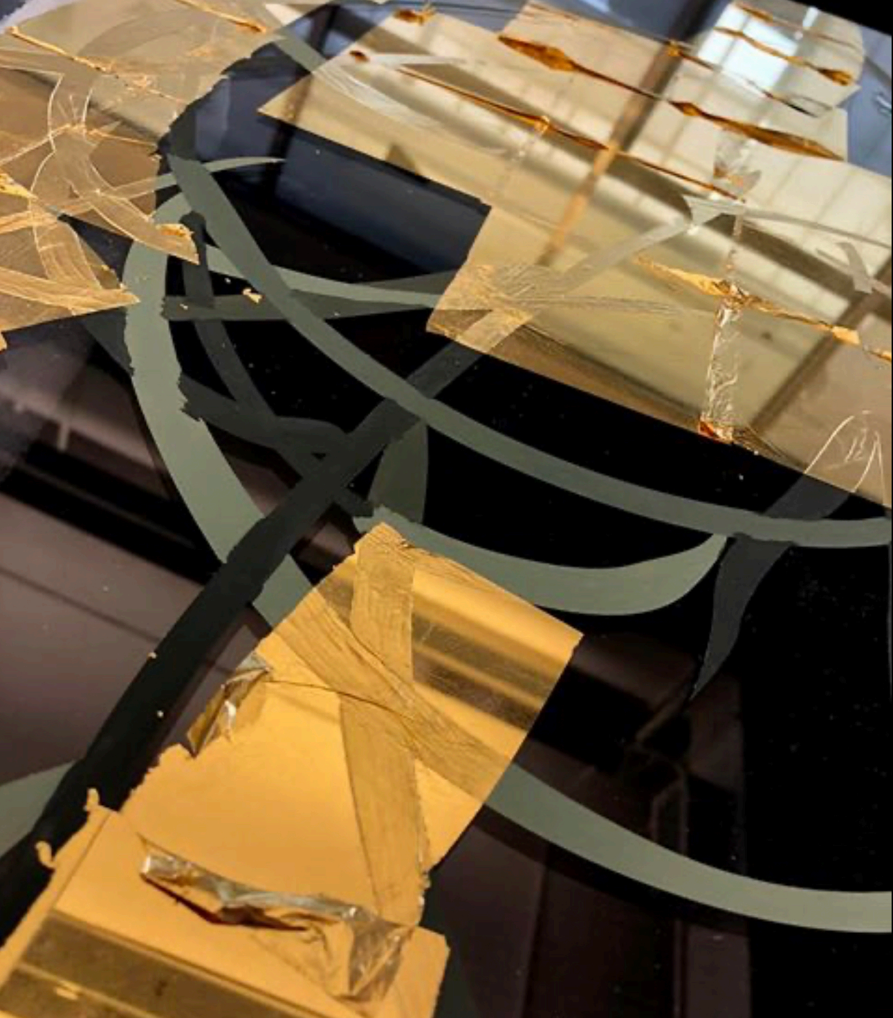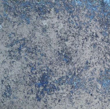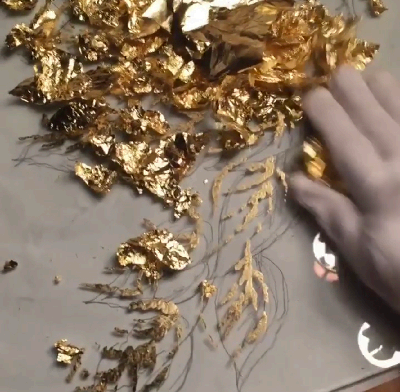 d. 将碎片状金属箔洒在已经用胶水绘制好的玻璃饰面上,然后用手来回拨动金属箔,最后留下金属色的图案。