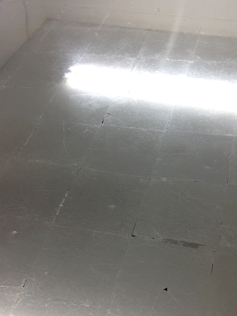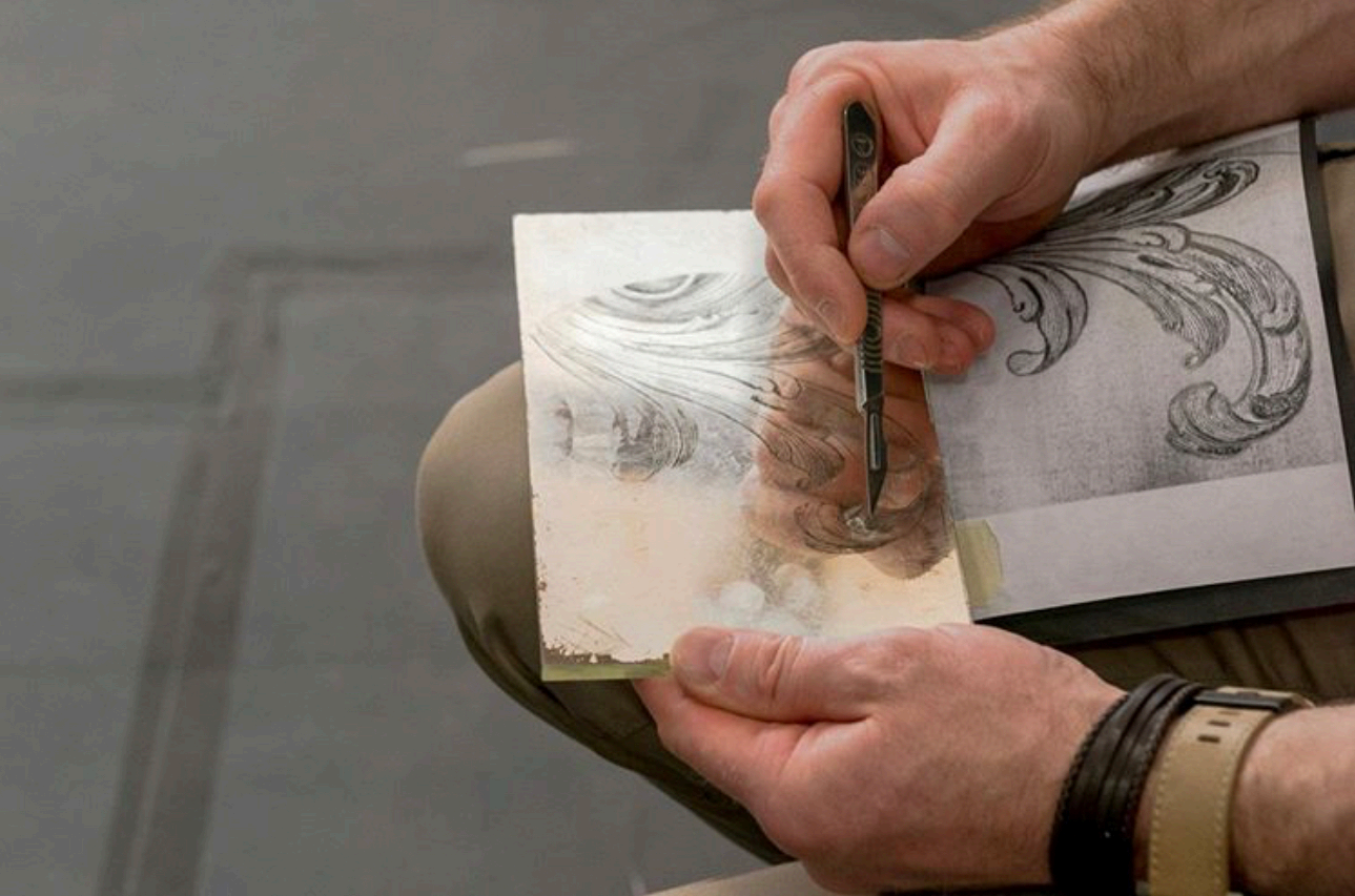 b.将已经附着上金属箔的玻璃饰面进行做旧,即通过刷子或刻刀等工具磨去部分的金属箔,当需要细小的刻画时会经常使用这种方法。