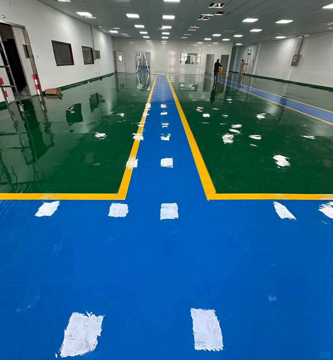 b、环氧自流平:通常色彩亮丽,耐磨度和洁净度较高,广泛应用于医药、汽车、电子、食品、电力、化工等工业地坪装饰中。