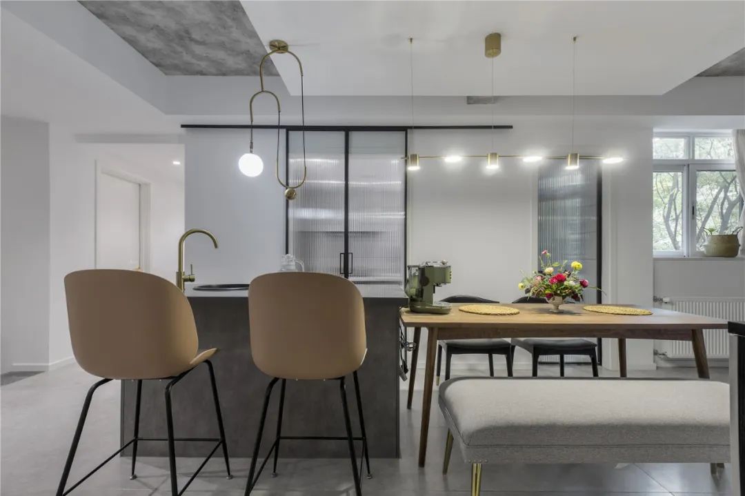 厨房加入长虹玻璃,既能保证餐厨区域的采光,也能起到隔绝油烟的作用。做饭时厨房里有点乱也不怕,朦胧感为你挡住那些不美观!▼