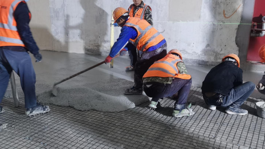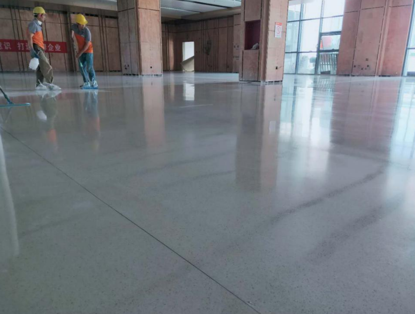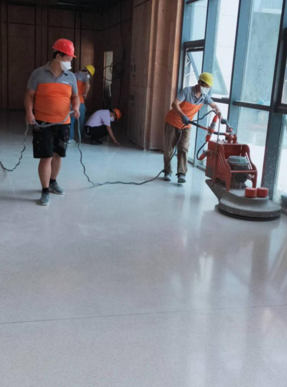 流程:基层处理→铺设PE薄膜→抗裂钢筋网→浇筑抗裂砂浆→基面糙化处理→确定结构分区→界面剂封闭→造型装饰分隔条→无机磨石面层摊铺→地面研磨与微孔修复→硬化增密及研磨抛光→表面精细处理→表面抗污处理→完工验收