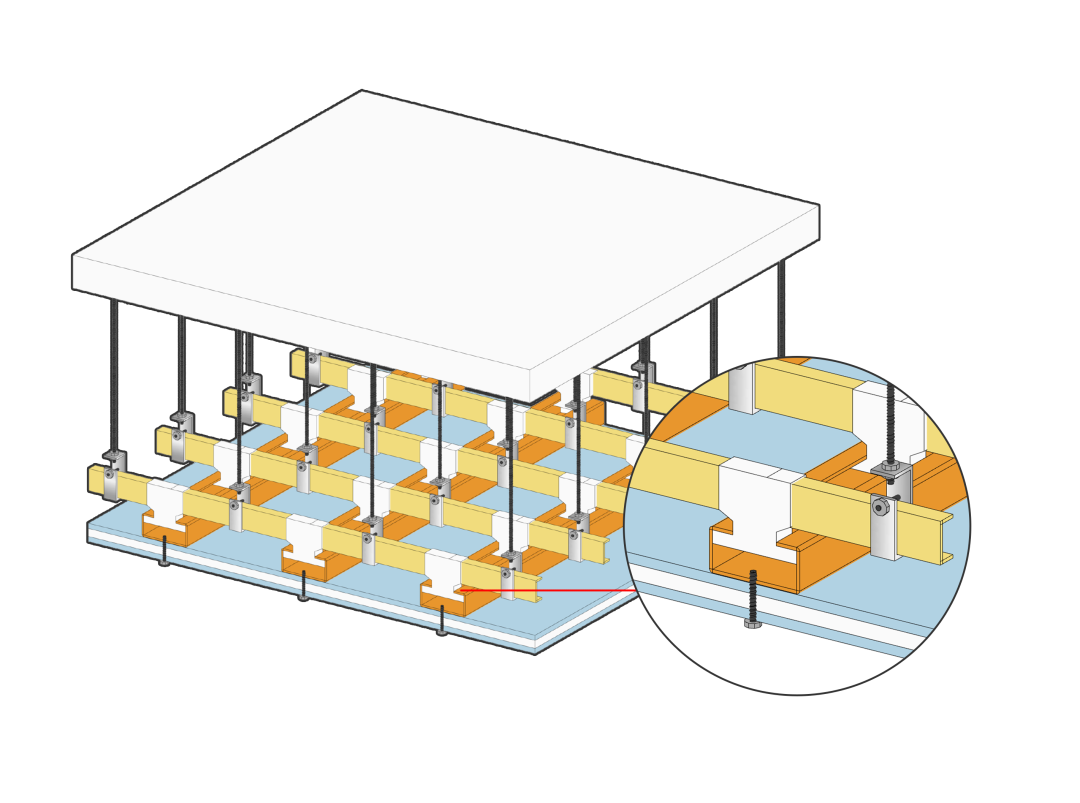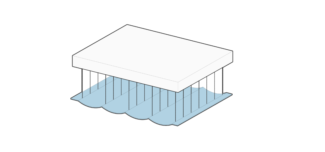 转换层可以理解为钢结构的天花板,通过降低天花板的高度来缩短吊杆和躲避设备,目的同样是让吊顶避免气流引起的不稳定。