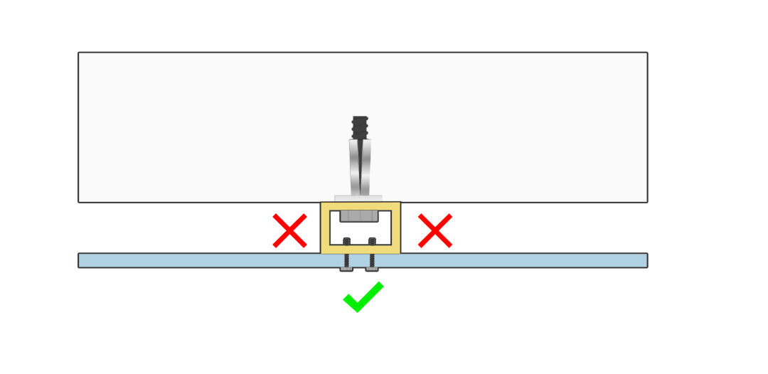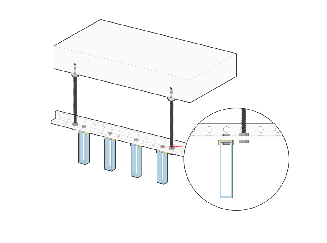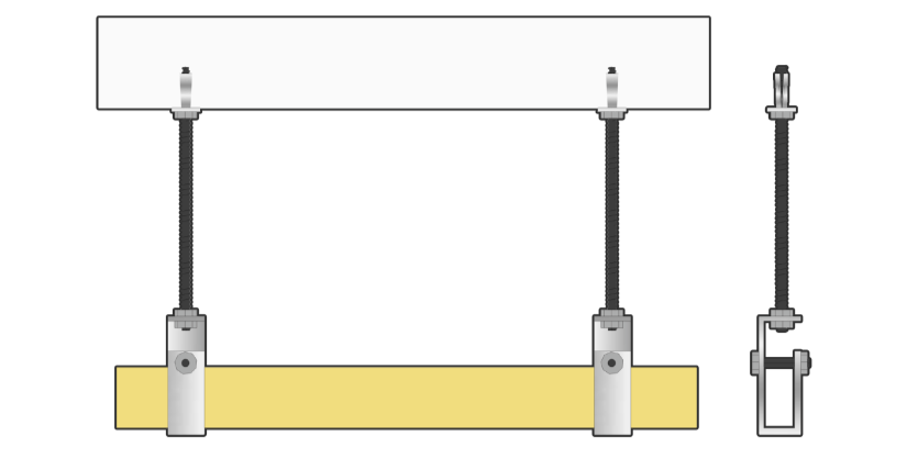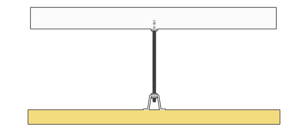这类龙骨比较适用于吊顶空间较小的情况,不需要吊杆,直接采用膨胀螺栓和龙骨即可。我们可以把龙骨看作一个长方体,那么龙骨是怎么衔接结构层和面层的呢?首先,我们能想到的是直接用膨胀螺栓固定龙骨和结构层,再用螺丝从面层下方连接龙骨。