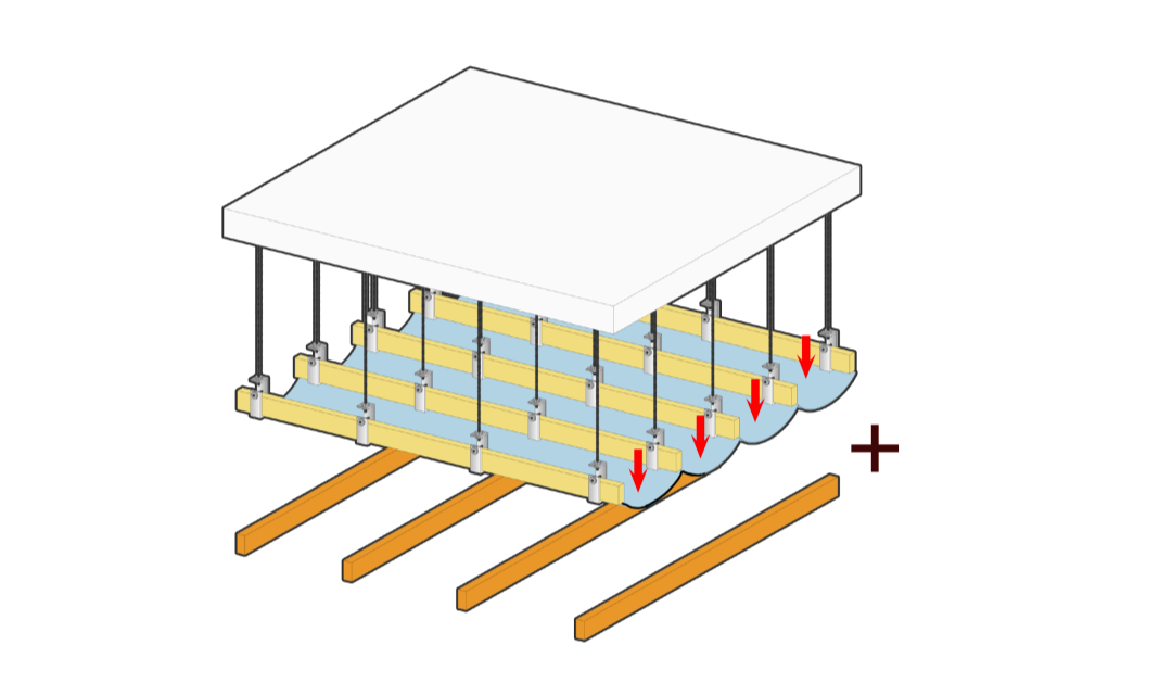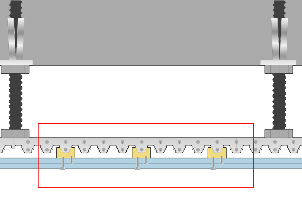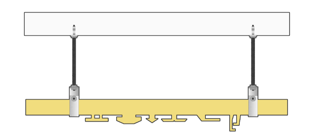 如果面层再厚一点,那么依靠面层自身不能与结构层相连,单凭吊杆,面层会因受力不均产生形变和下垂。这时候需要一系列钢架作为面板的支撑,也就是龙骨。