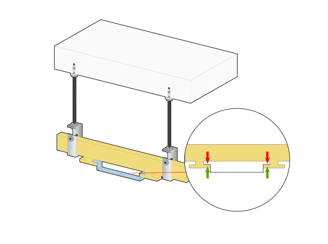 “卡槽式”固定主要依靠有序的排列组合,在龙骨上安装不同尺寸的“挂钩”去悬挂面层。其原理是通过龙骨和面层边缘的造型形成卡口互相嵌套完成。这种方式第一个好处是省去连接小件,既节省成本又不易发生小件生锈等问题。第二个好处是组合强度更大,由于面层和龙骨多处受力衔接,不易发生龙骨变形等引起的吊顶起波浪现象。