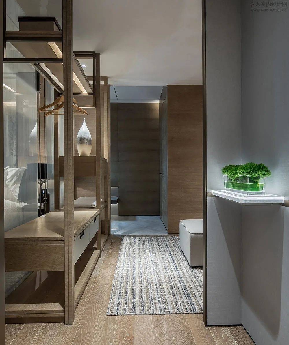 如果是酒店性质,那展示功能会更多一些,储物量相对减小,将起居空间和床品并置则可以将空间放大,而相对来说衣帽间则可以适当缩小。