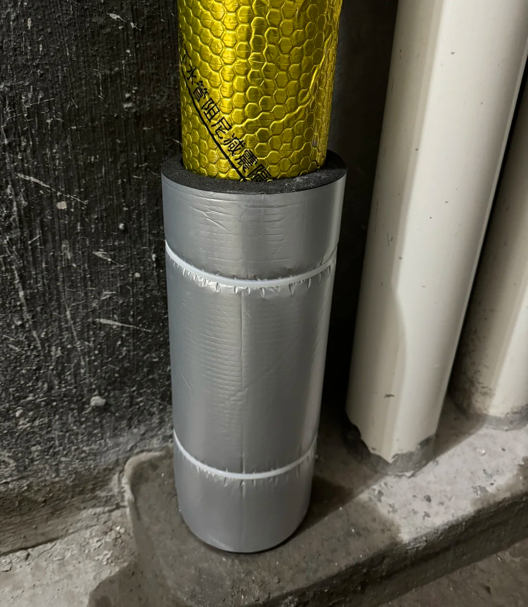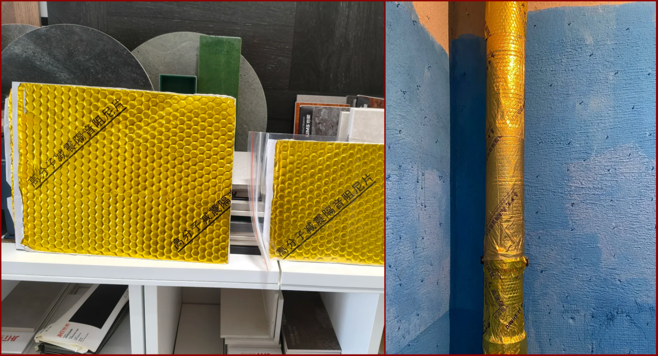 单价高(18~25元/m,Φ110管),满缠成本≈橡塑棉3倍。仅对振动有效,对水流“哗哗”高频声几乎无效,必须叠加吸音层。夏季高温环境易侧向溢胶,需铝箔或扎带外封。