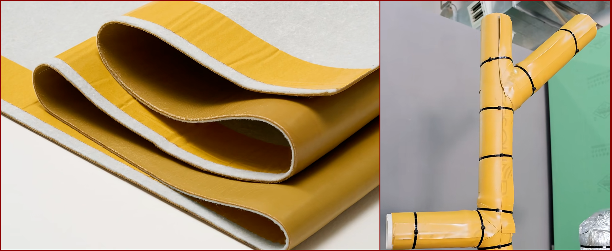 1.2mm~2.0mm厚,背面自带丁基胶,可直接缠绕管道。面密度2.0kg/m²左右,属于“质量-弹簧”系统中的重层。