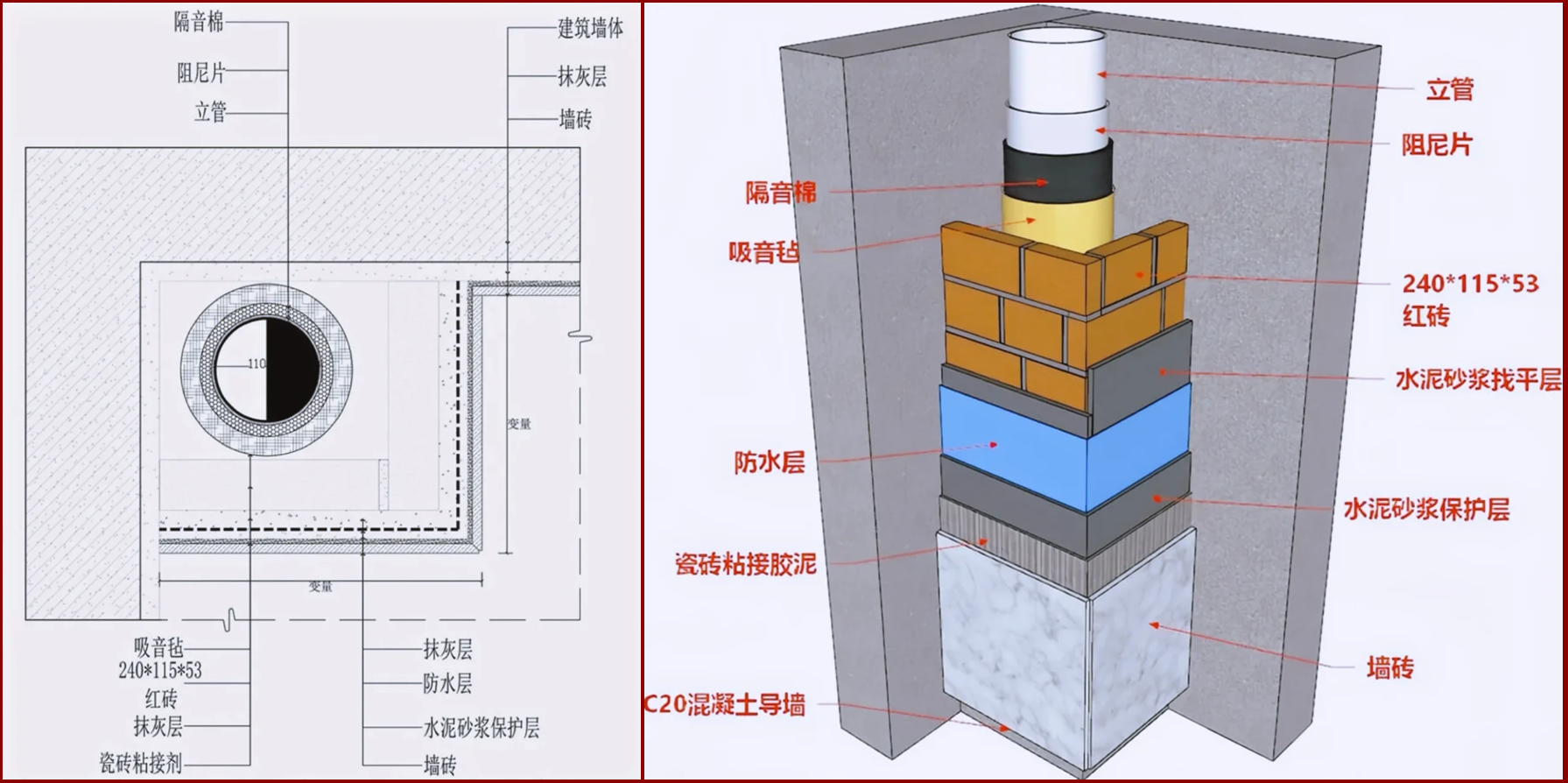 材料:普通红砖、水泥砂浆、阻尼隔音毡、橡塑保温壳。