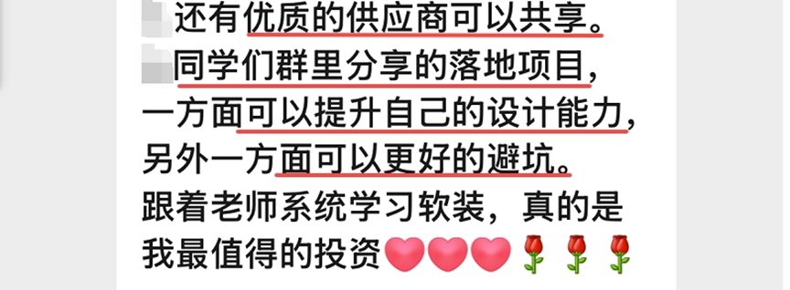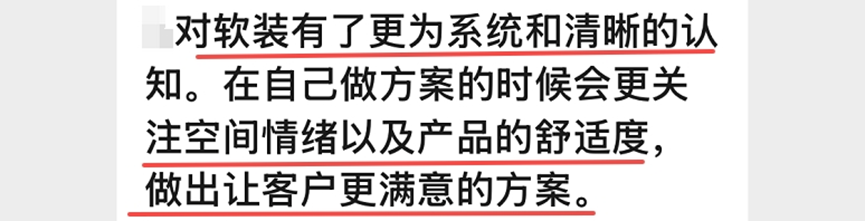 1、通过专业服务提高90%的客户满意度软装方案班和全案落地班会帮助设计师系统学习,避免碎片化,提高项目落地的效率,从软装新五感中班关注到空间情绪,软装产品的舒适度来选品,提高了高端客户的满意度,也提高了方案汇报与理解能力。