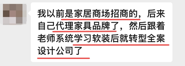 2022 年10 月,她听过设计得到抖音直播了解到到设计得到里的软装系统课,体验了《软装全案落地班》里“软装方案设计的逻辑”的,原本选选品只是碎片化的美丑来选,通过专业学习克服掉“凭感觉选软装”的痛点。抱着“学会就能消化手里的项目” 的期待,加入课程系统学习。这位同学最早是做家居商场招商的,后来自己代理家具品牌了,然后跟着设计得到系统学习软v装后就转型全案设计公司了,2023年成立自己的全案设计公司,目前行业内业绩也比较平稳,项目越来越高端,目标也更清晰了。
