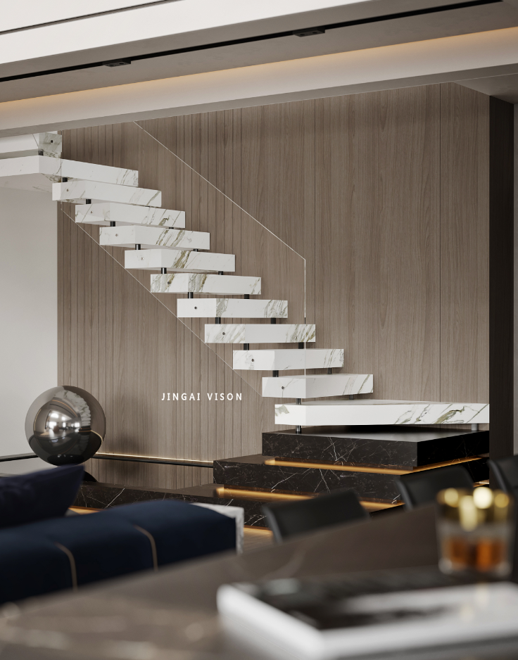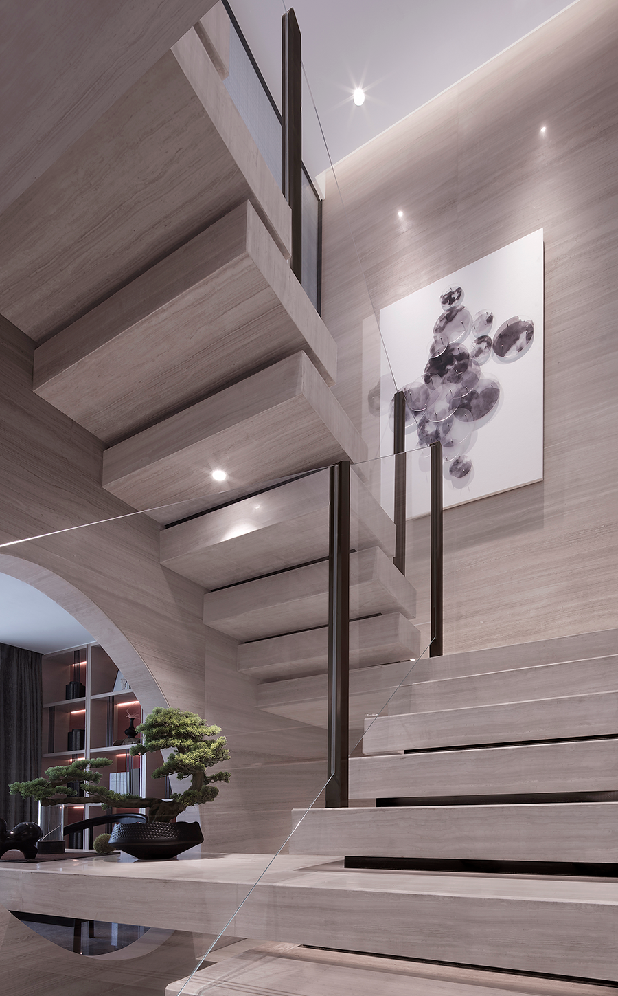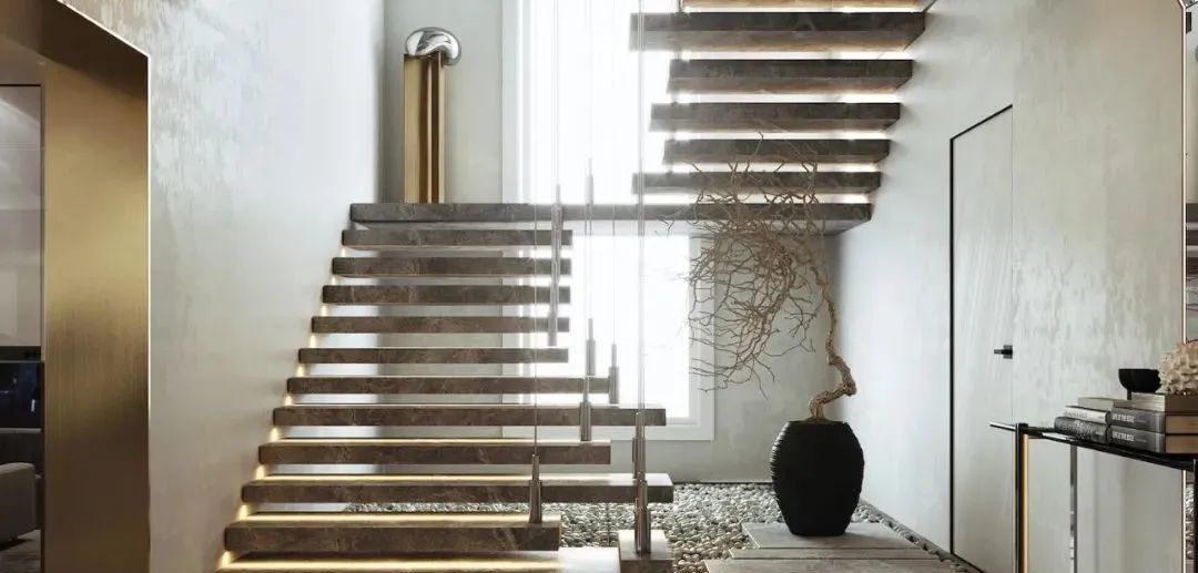 其特点是踏板之间没有支撑的楼梯设计,使其看起来好像楼梯是漂浮的错觉,正是出于这个原因,悬浮楼梯在现代别墅的设计中非常受欢迎。