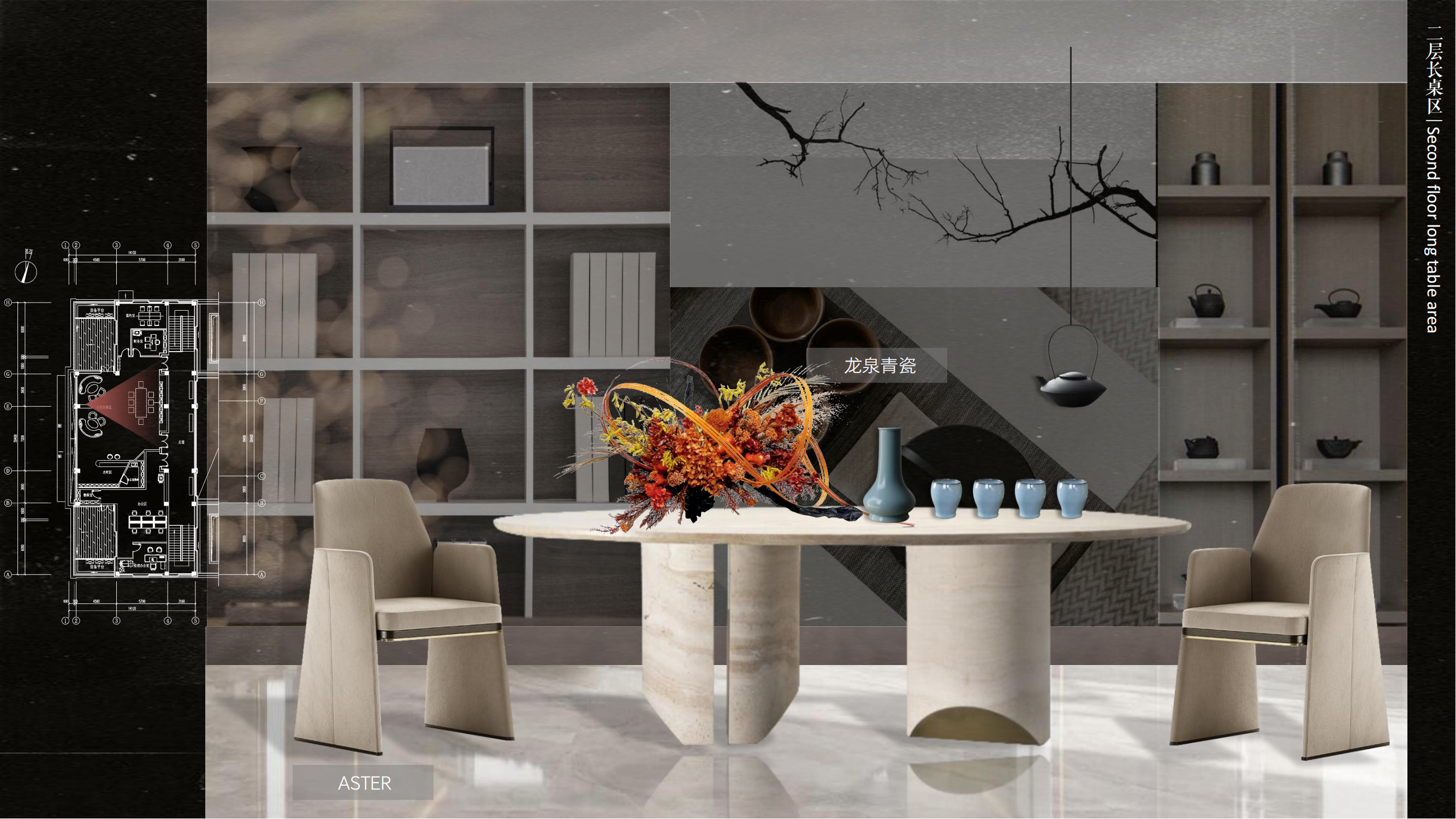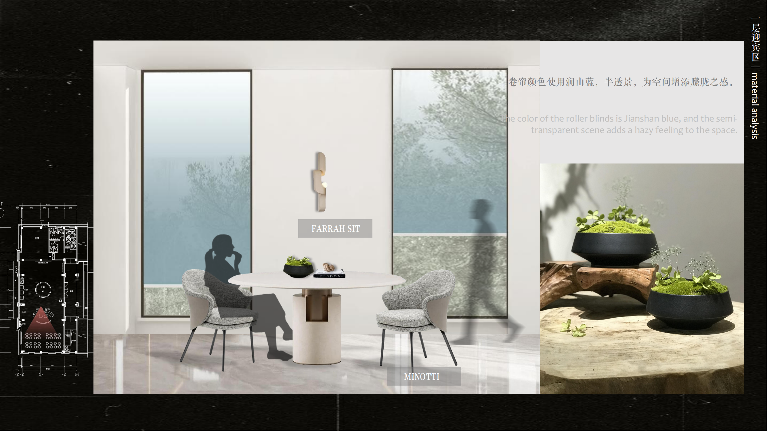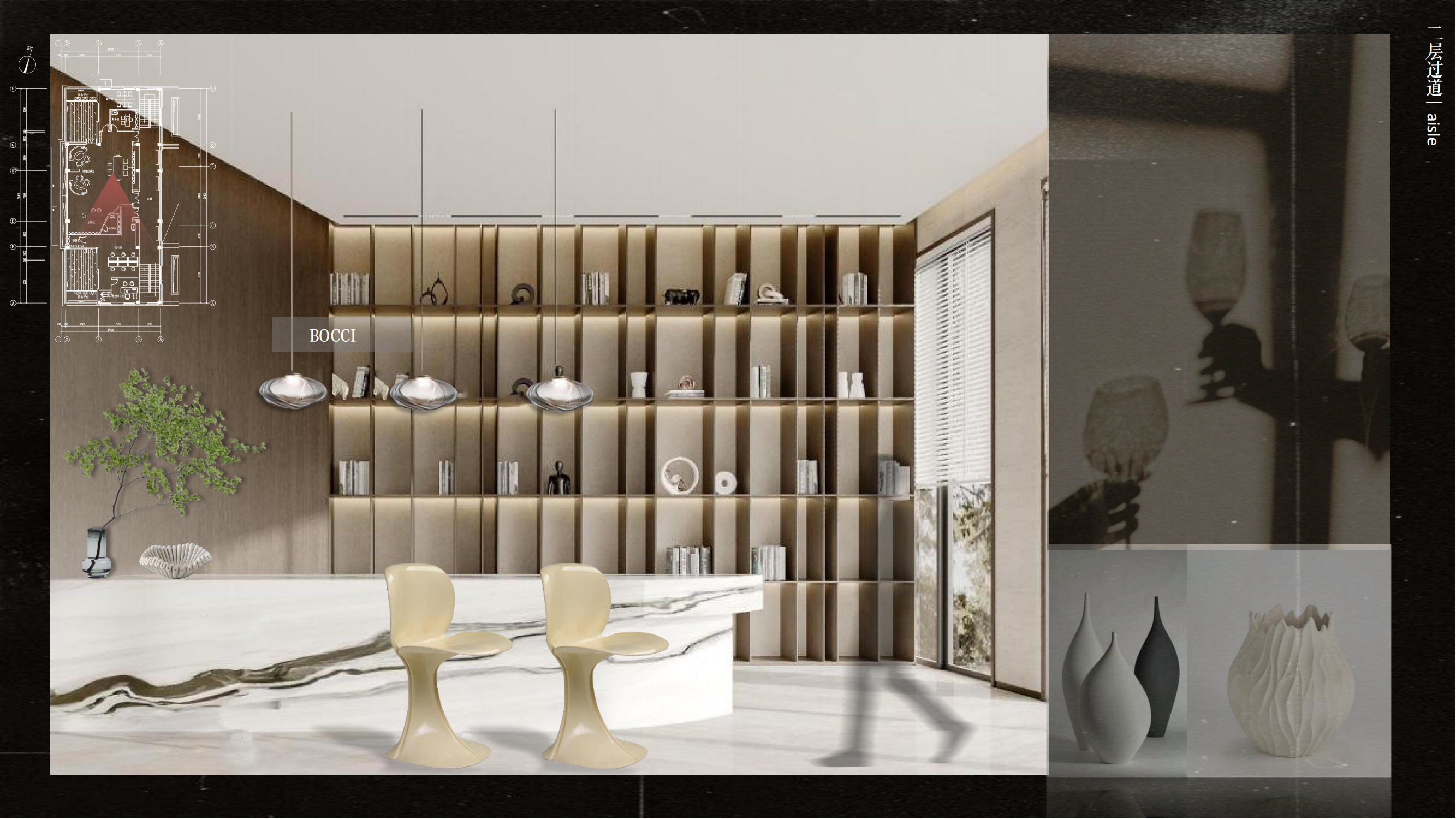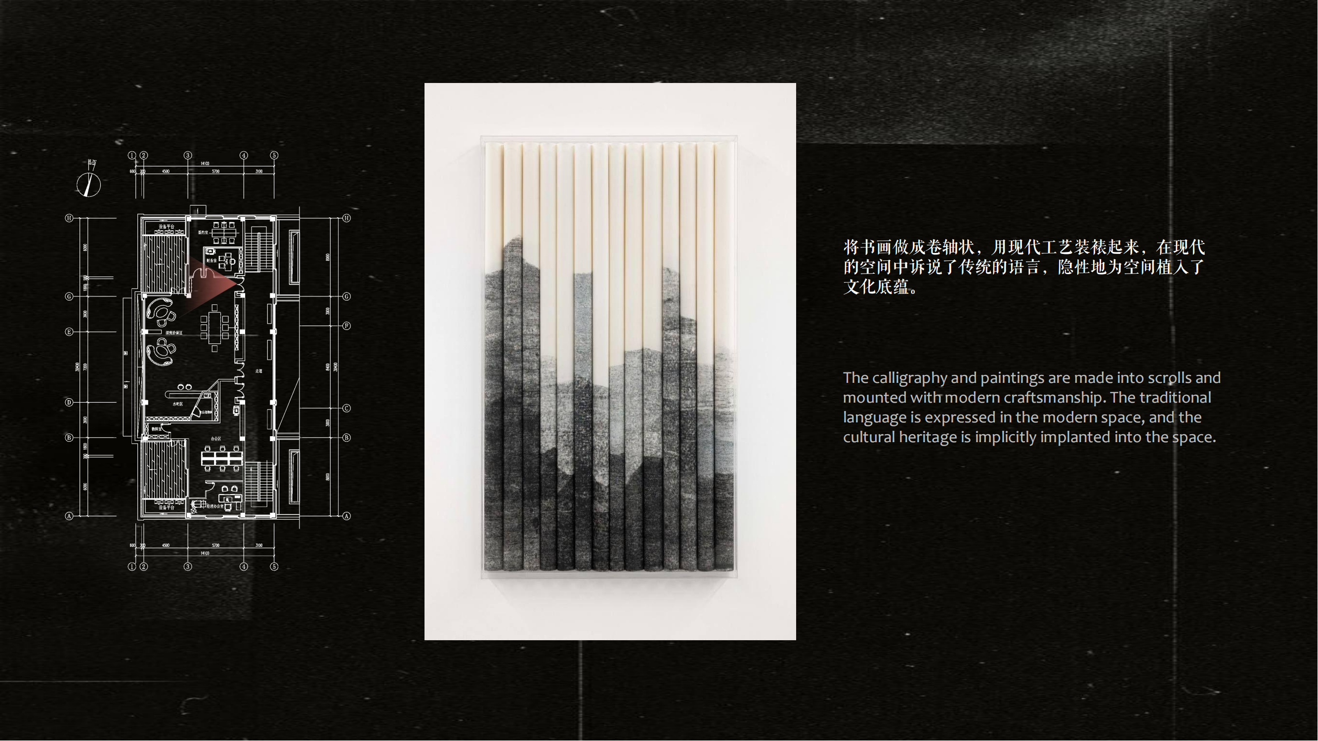 在现代化的空间当中,使用中国传统的元素和色彩体现文化自信,将传统的元素进行解构使其现代化,在空间中体现传统与当代的对话与交流。体现东方美学的生活方式与生活态度。