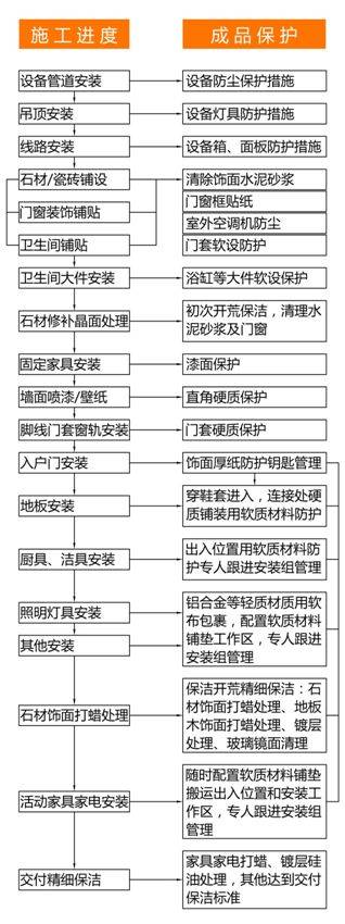 精装房成品保护是分阶段、分内容、分措施、分管理以及维护整个过程,若是针对单项进行,将得不偿失。所以我们有必要先弄清楚施工各阶段的前后顺序再做针对性的成品保护措施。