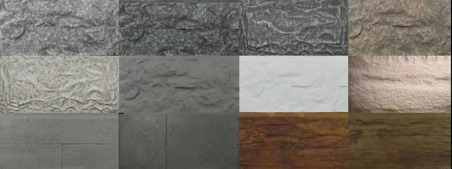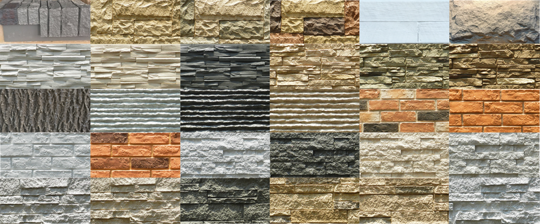 所有文化石的造型PU石都具备,比如我们传统概念中的长城石、瓦板、流水石等。除此之外还有较具特色的混凝土水、泥板、蘑菇石。