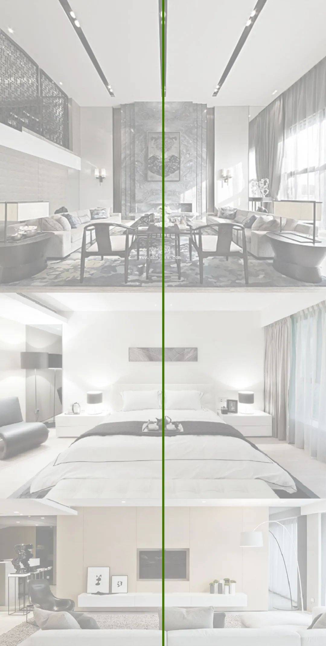 中期的时候,以梁志天为首的港式风格开始风靡整个中国,梁志天老师也是典型的对称手法的遵循者。与早期的对称不同,此时的空间材质相对简化许多,多以亲人的材质为主,少了纯粹的装饰造型,更加回归居住的真实体验。此时的空间处理更加单纯,多用赶紧的大面材质进行对称处理,加入了一些金属或分缝的细节。对称还是对称,但空间更加干净简洁。