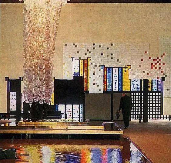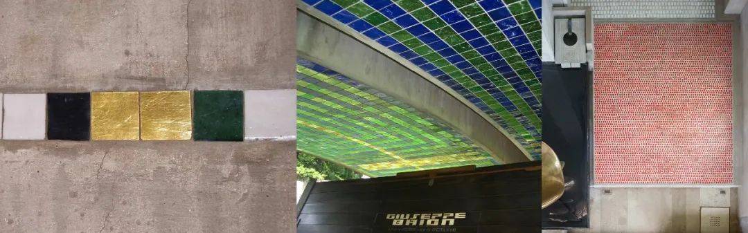 之前时常水患成灾,但在建筑师斯卡帕的眼里,水并不是一个问题,而是一个灵感的来源。他没有把水拒之门外,反而让它在建筑里流动得更加自由,更加戏剧化:水从水道入口的铁栅门流入,沿着墙进入展室,走道成为了桥。不同潮位的水在分级的地面上涨落,构成了不同形状的图案只要时间在流淌,新与旧就是一个永恒的课题。b.手工业产品威尼斯发达的手工业产品在斯卡帕的运用下,起到了画龙点睛的作用。其中对于马赛克的应用尤为具有威尼斯特色。这些极具特色的马赛克都来自于一个威尼斯当地传统的手工艺品牌:Orsoni。
