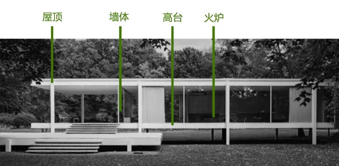 这不是字面意义上的火炉、屋顶、墙体和高台。而是将古典建筑解构式的解读归纳,从而形成的四大元素,具体我们举例可以看下密斯凡德罗的范斯沃斯住宅。其实在赖特的几乎全部建筑以及柯布西耶的早期建筑都有收到这个理论的影响。此处不再展开,感兴趣的可以去深挖。