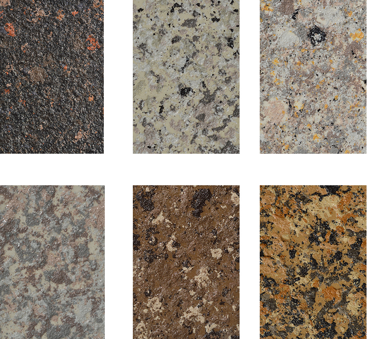 通常是仿大理石或者板岩,通过对丙烯酸类骨浆涂料的揉色处理,同时以各种工具辅助制作出各类天然石材的化学侵蚀痕理。